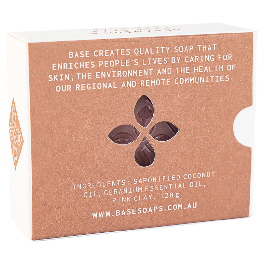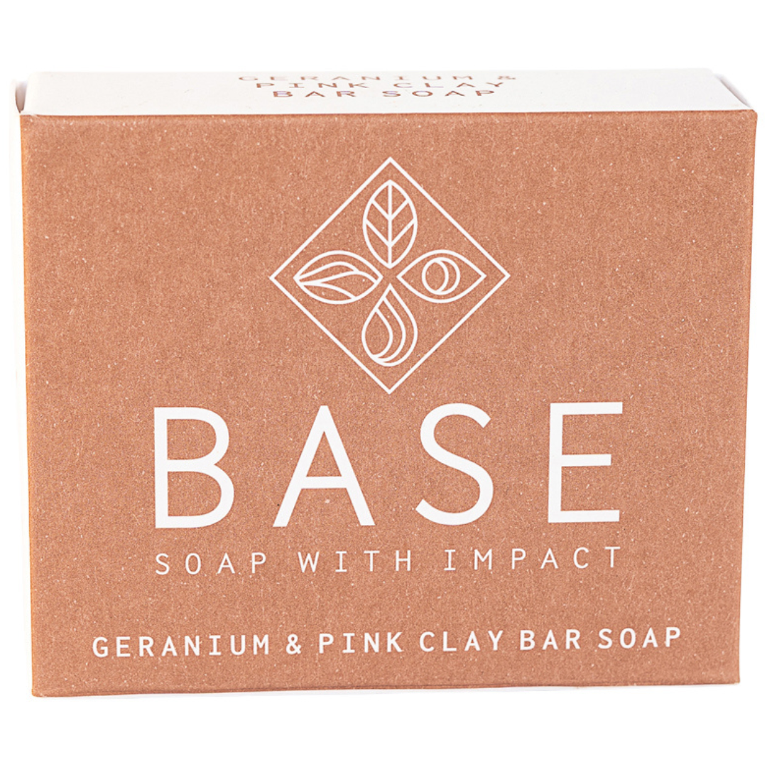 The Base Soaps Geranium and Pink Clay Bar Soap combines a sweet floral fragrance with nourishing pink clay for a mild, hydrating cleanse. Originally introduced as a limited edition, its popularity secured it as a permanent favourite. Perfect for use in the shower or at the sink, this beautiful bar adds a touch of elegance to your routine. Feel refreshed and pampered with this naturally nourishing bar that smells as good as it looks.