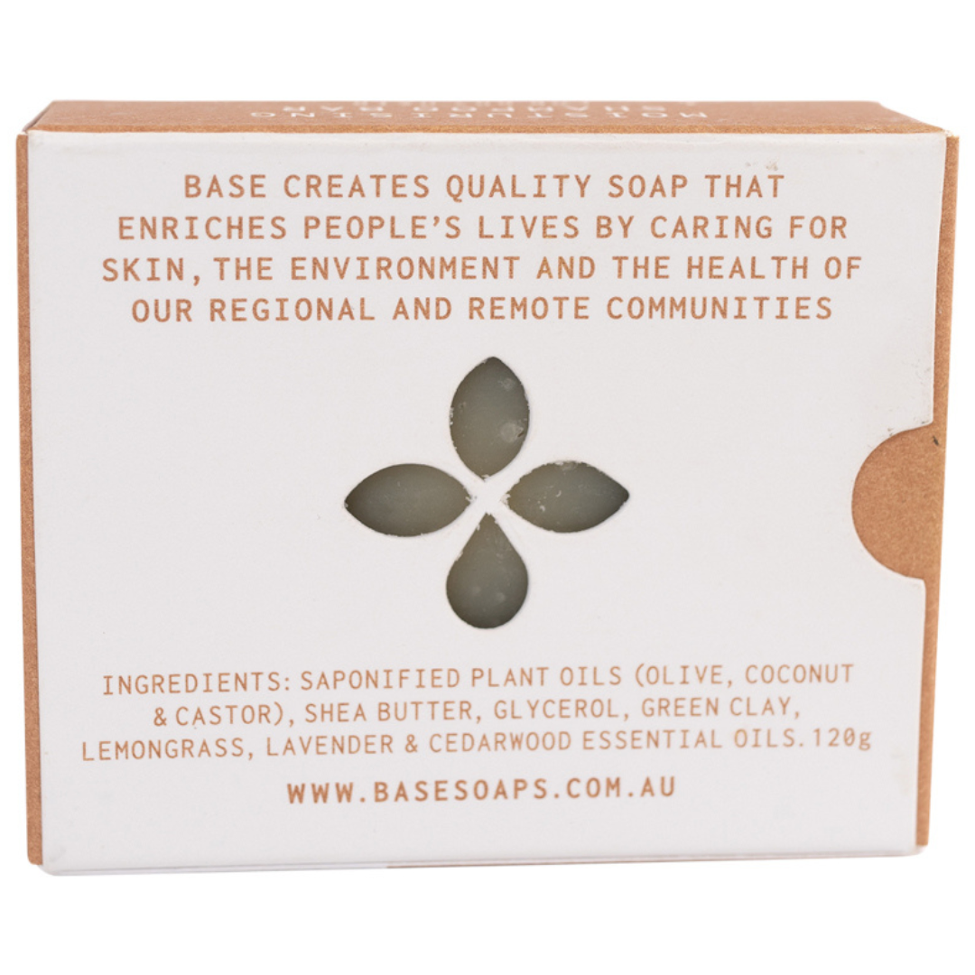 Saponified plant oils (olive, coconut and castor), shea butter, glycerol, green clay, lemongrass, lavender and cedarwood essential oils. This bar is made with natural ingredients and is palm oil free. 100% ethically sourced and produced.