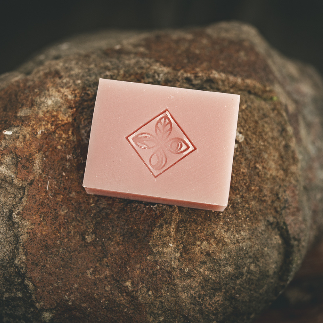 Saponified plant oils (coconut, olive, castor, cocoa butter and sweet almond), pink clay. 110g. This bar is made with natural ingredients and is palm oil free. 100% ethically sourced and produced.