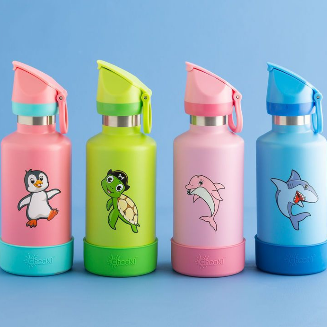 The perfect size for little hands, Cheeki kids double wall vacuum insulated water bottle will make sure their every sip stays icy cold for 24 hours. Designed with Cheeki Tri Tech™ lid means there is three different flow settings – so as they grow up, they can adjust the setting to suit! Designed with a rubber handle for easy gripping you won’t have to worry about it being dropped out of those sometimes slippery hands. Leak proof, BPA and toxin free you can be put at ease knowing there is no hidden nasties living in your Kids Bottle. Each Cheeki Kids Bottle comes with a sticker pack of all the Cheeki Ocean Friends. Recommended for ages 4 and up. Cheeki Kids Bottle Lids can be interchanged with Cheeki Tri-Tech Sports Lid.