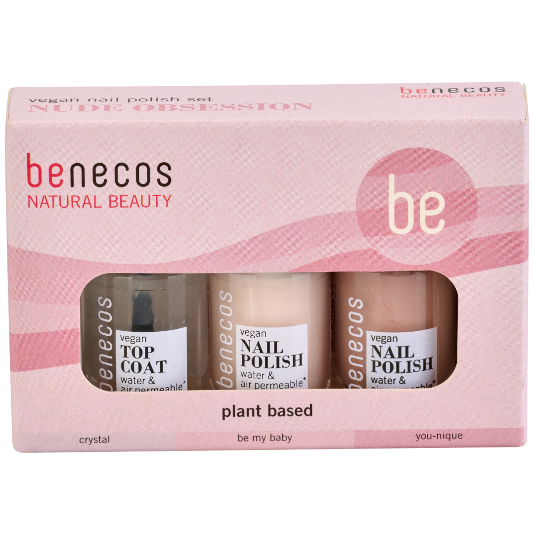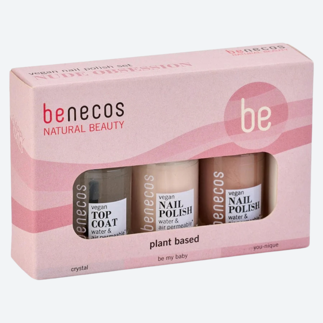 Benecos Nail Polish Set nude obsession is your new go-to for effortlessly elegant nails. Featuring the soft nude shades be my baby and you-nique, plus top coat crystal, itās the perfect trio for a polished, natural look.
