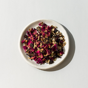 Organic Merchant Women’s Wellness tea is a vibrant loose leaf tisane imbued with grounding earthy elements, nourishing fruit spice and divine rose overtones. This naturopathic formulation has traditional benefits and plant compounds that are adaptogenic, antioxidant, calmative, hormonal tonic, mineral rich and restorative which may naturally support the many hormonal changes that women experience in various stages of life, from PMS to menopause. We love this herbal tea for women’s health and hormone support. This tea is not suitable to drink during pregnancy. Enjoy as a daily tonic. Naturally caffeine free.