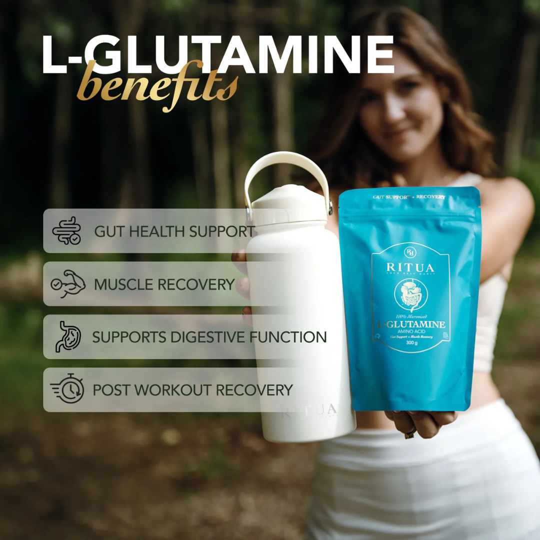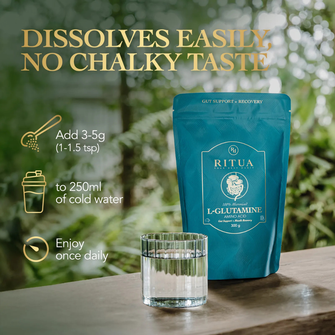 Ritua L-glutamine is the most abundant amino acid in the body and plays a key role in gut health and immune function. This can support digestion, nutrient absorption and may help reduce intestinal permeability during periods of stress, intense exercise or illness.