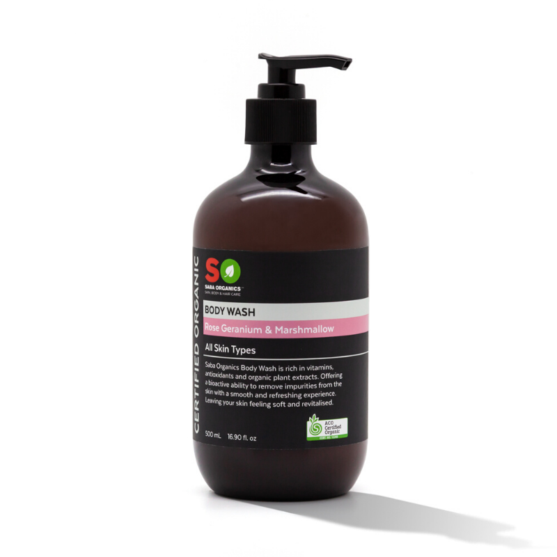 Saba Organics Certified Organic Body Wash Rose Geranium & Marshmallow is rich in vitamins, antioxidants and organic plant extracts. Offering a bioactive ability to remove impurities from the skin with a smooth and refreshing experience. Leaves your skin feeling soft and revitalised.