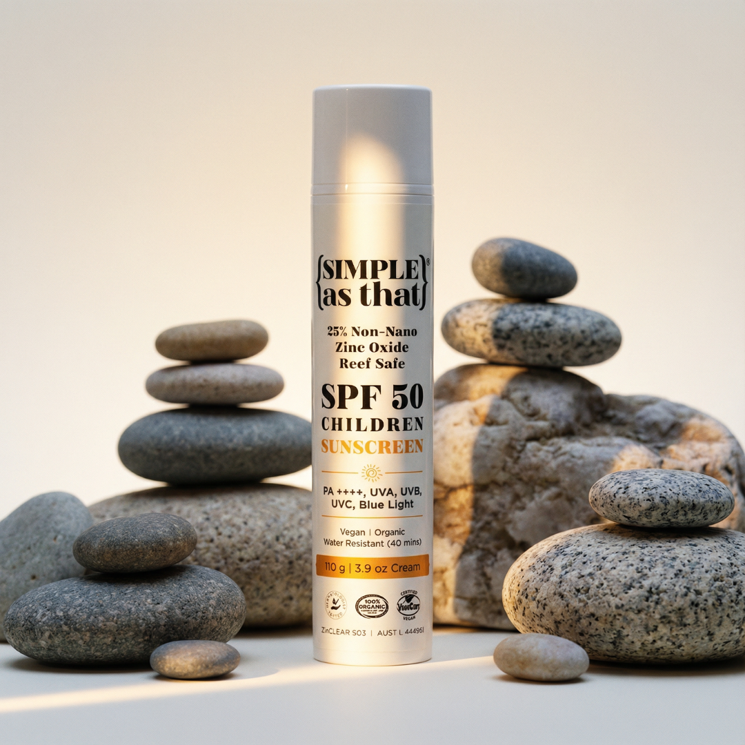 Simple As That Organic Vegan Children's Sunscreen SPF50 is made exclusively from minerals, organic plant extracts (including oils) and purified water. As such, consistency and colour may vary.