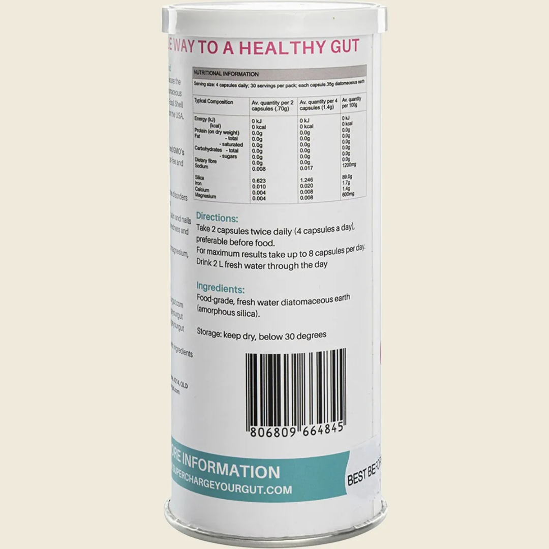 Supercharged Food Love Your Gut Capsules are ideal for gut health on the go! With all the benefits of the original Love Your Gut powder and more! Love Your Gut Powder has a very simple and natural approach to gut health. As many gut issues can be traced back to an unclean and inefficient digestive tract, Love Your Gut Powder contains naturopathic grade, organic diatomaceous earth which helps to clean out the accumulated build-up of waste, toxins, metals and mucus in the digestive tract. Itās also anti bacterial, anti viral, anti fungal and anti parasitic. You will notice that youāll have better digestion, waste removal and increased nutrient absorption. Like your teeth, plaque and waste continually build up within your digestive tract so itās beneficial to āsweep awayā these impurities on a daily basis and keep your colon toned, clean and efficient. Love Your Gut Capsules contain one month supply in capsule form - 120 capsules.