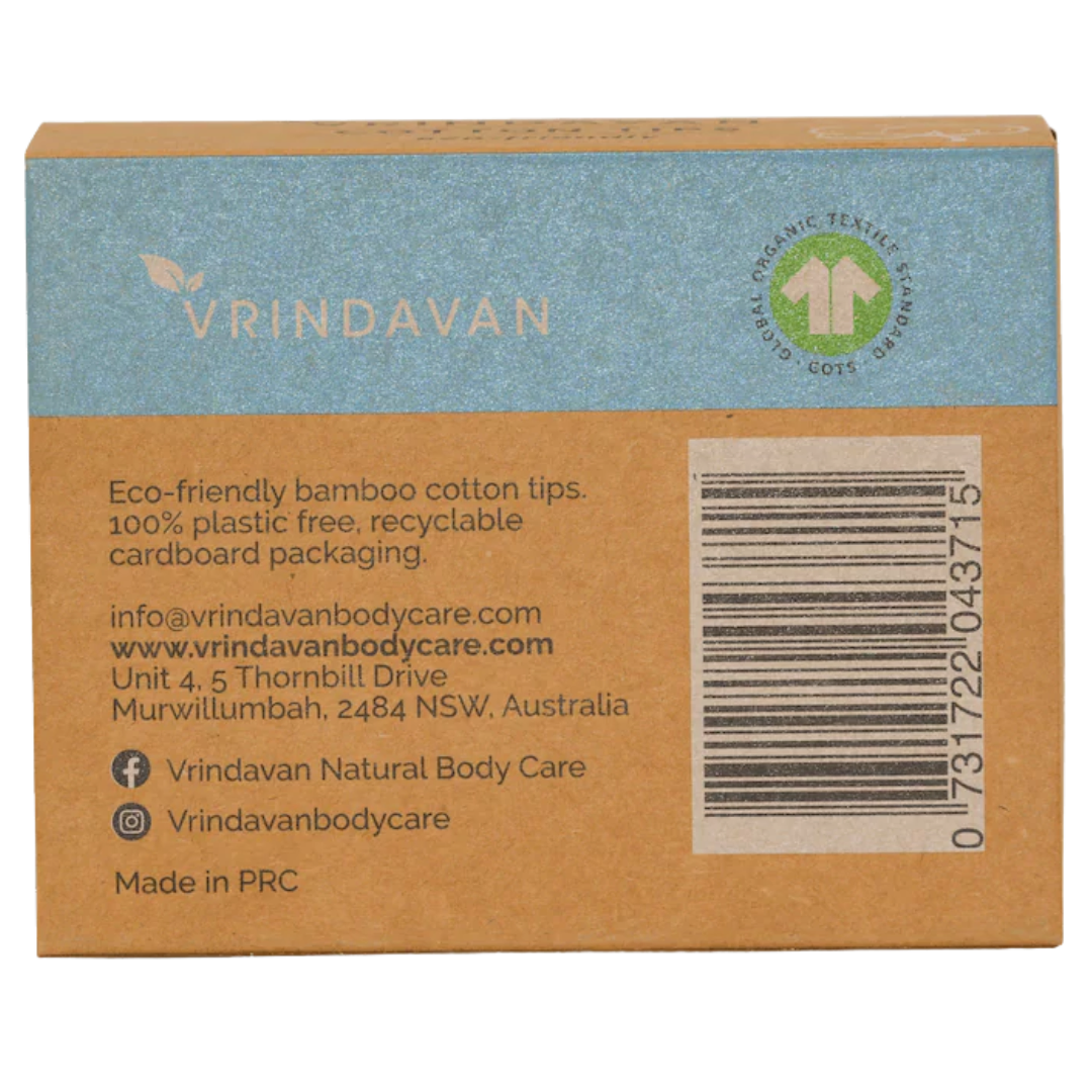 Vrindavan Body Care’s Organic Cotton Tips are an eco-friendly alternative to traditional cotton buds. Made with sustainable bamboo stems and 100% GOTS-certified organic cotton, these tips are plastic-free and packaged in a fully recyclable cardboard box. Perfect for beauty, hygiene, and everyday use.