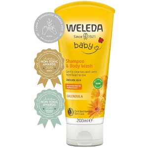 Trust Weleda lightly foaming 2 in 1 baby body wash and baby shampoo formulated with beneficial, natural ingredients like organic calendula extract to gently cleanse delicate skin, leaving skin soft and baby hair easy to comb. Gentle almond oil helps to prevent dryness, and the soft lather doesn’t sting baby’s eyes. No tears, no tugs, no roughness – just a clean, sweet smelling, wriggly baby. Also suitable for use with cradle cap on baby hair. Extra mild on the eyes. Weleda Baby Shampoo & Body Wash Calendula is delicately scented. Kind calendula gently cleanses delicate skin and hair, so everyone has fun at bath time. Recycle your empties with our TerraCycle® Recycling Program.